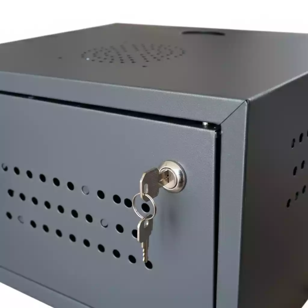 شیشه سکوریت (Tempered Glass) ساخته شده است که علاوه بر زیبایی، امکان مشاهده وضعیت تجهیزات داخلی را بدون نیاز به باز کردن درب فراهم میکند. این نوع شیشه در برابر ضربه و تغییرات دمایی مقاومت بسیار بالاتری نسبت به شیشههای معمولی دارد و در صورت شکست، به قطعات کوچک و غیربرنده تبدیل میشود تا ایمنی محیط حفظ شود. قفل سوئیچی فلزی نیز امنیت فیزیکی تجهیزات شما را در برابر دسترسیهای غیرمجاز تامین میکند.