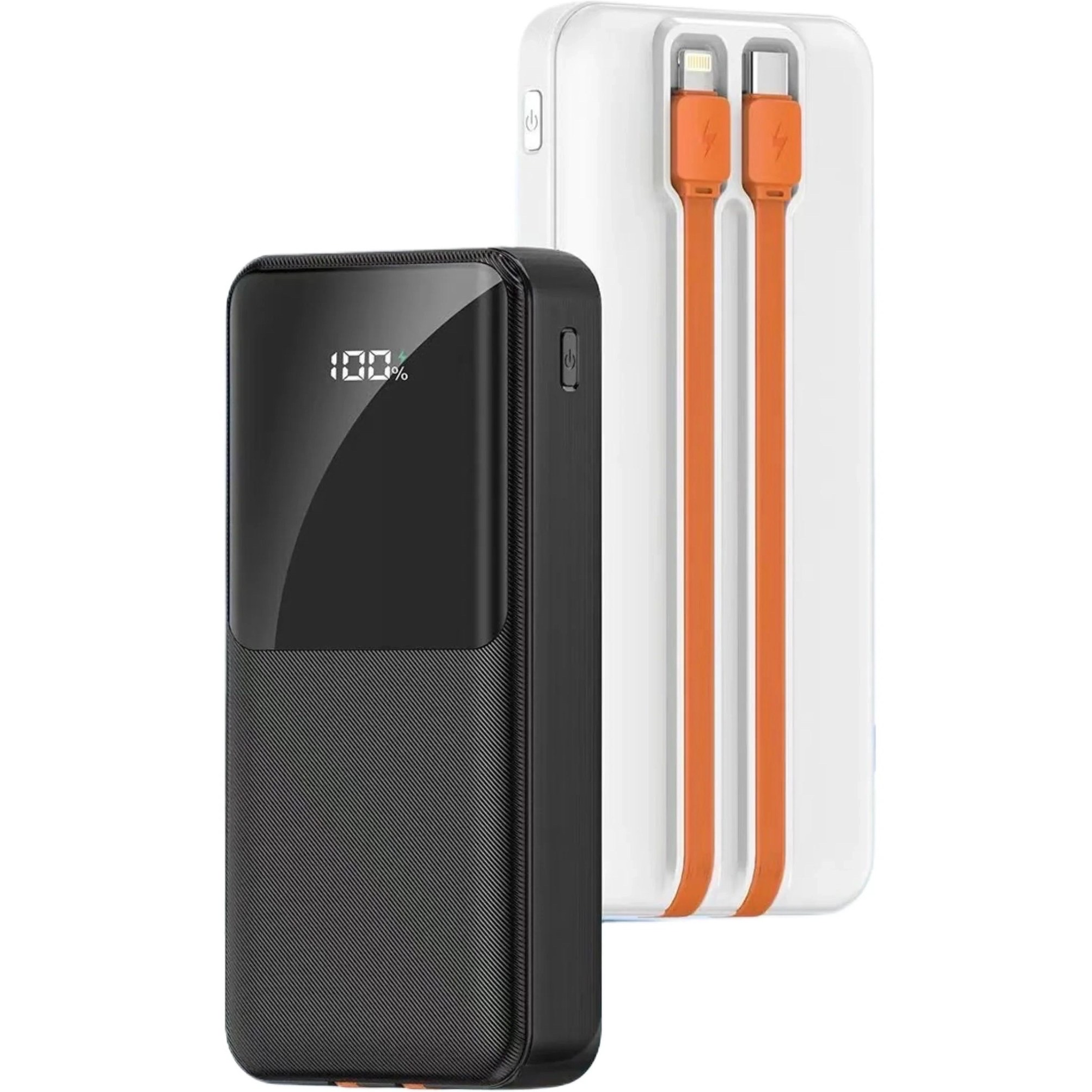 با توجه به تصویر محصول که کابلهای مجتمع لایتنینگ و USB-C را نشان میدهد، این پاور بانک احتمالاً دارای پورتهای خروجی USB-A و USB-C است و یا حتی کابلهای شارژ با این کانکتورها به صورت داخلی تعبیه شدهاند. این تنوع در پورتها و کابلها، سازگاری گستردهای با انواع دستگاهها از جمله گوشیهای آیفون، اندروید، تبلتها، هدفونها و حتی لپتاپها را تضمین میکند. هر دو کابل نارنجی رنگ در تصویر دارای نماد صاعقه هستند که به وضوح نشاندهنده پشتیبانی از شارژ سریع برای دستگاههای متصل است.